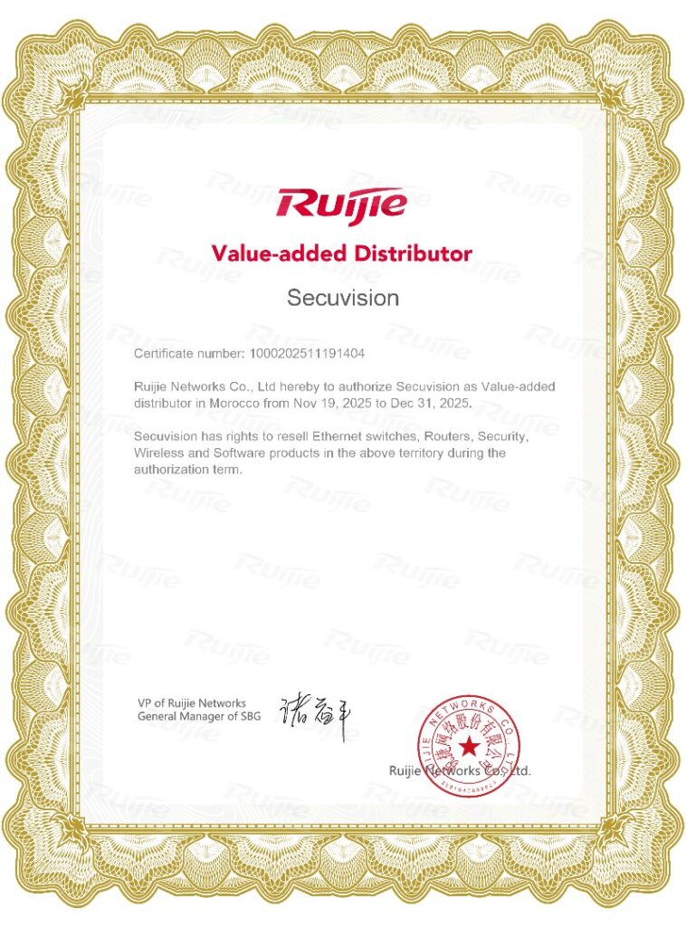 Secuvision franchit une étape majeure dans son développement : nous sommes désormais Distributeur Ruijie au Maroc, officiellement certifié par Ruijie Networks Co., Ltd. Cette reconnaissance internationale confirme notre engagement à offrir aux entreprises marocaines des solutions réseau fiables, performantes et adaptées aux environnements professionnels les plus exigeants.